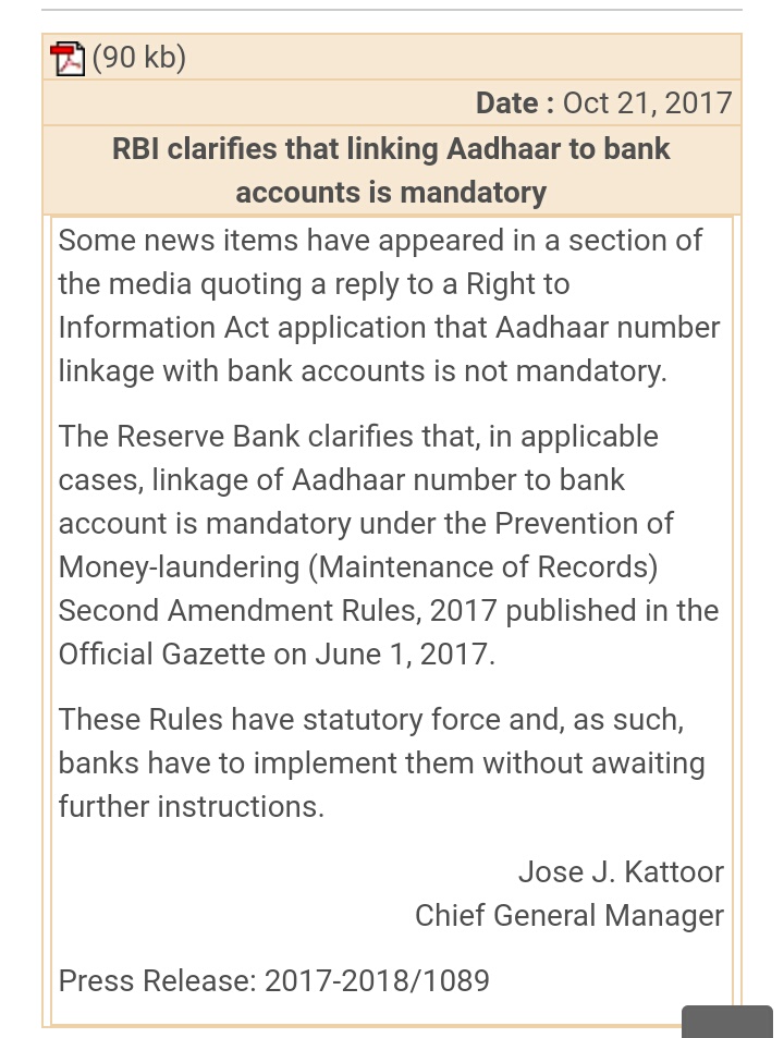 ജൂലൈ ഒന്നിലെ നോട്ടിഫിക്കേഷന് നില നില്ക്കുന്നതാണെങ്കില് തന്നെ, സ്വാഭാവികമായും അതിനെ തുടര്ന്ന് ആര് ബി ഐ യുടെ സര്ക്കുലര് വരേണ്ടതാണ്. അതാണ് കീഴ്വഴക്കം. അത് ഇതുവരെ ഉണ്ടായിട്ടില്ല. എന്നിരുന്നാലും റിസര്വ് ബാങ്ക് ക്ലാരിഫിക്കേഷന് നല്കിയിട്ടുള്ള സാഹചര്യത്തില് തര്ക്കത്തിനു പ്രസക്തിയില്ല. അതു പ്രകാരം ‘ബാധകമായ സന്ദര്ഭങ്ങള്’ ഏതൊക്കെയാണ്? അത് മേല്പ്പറഞ്ഞ പി എം എല് നോട്ടിഫിക്കേഷന് ബാധകമാകുന്ന സന്ദര്ഭങ്ങളെയാണ് സൂചിപ്പിക്കുന്നത്. അതില് പറഞ്ഞിരിക്കുന്ന ഭേദഗതികളിലെ സെക്ഷന് 17(എ) അനുസരിച്ച് ഒരു പുതിയ ബാങ്ക് അക്കൗണ്ട് തുറക്കാന് ആധാര് ഇപ്പോള് നല്കേണ്ടതില്ല. അക്കൗണ്ട് തുറന്ന തിയ്യതി മുതല് ആറ് മാസത്തിനകംആധാര് ഹാജരാക്കിയാല് മതിയാകും. നിലവിലുള്ള അക്കൗണ്ടുകള്ക്ക് 2017 ഡിസംബര് 31-ന് മുന്പ് ആധാര് ഇ-കെ വൈ സി വെരിഫിക്കേഷനും നടത്തേണ്ടതുണ്ട് എന്നാണ് പറഞ്ഞിരിക്കുന്നത്.